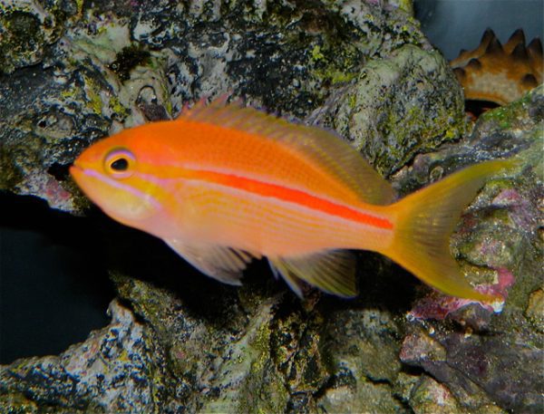 این ماهی به نام های آنتیاس ماهی خط قرمز یا نوار قرمز شناخته شده و مانند دیگر آنتیاس ماهی ها در مرکز آکواریوم شنا می کنند. برای نگهداری از این ماهی به آکواریومی با گنجایش 480 لیتر به همراه صخره های زنده فراوان که دارای مخفیگاه های زیادی برای پنهان شدن باشند نیاز است.
