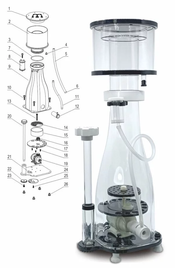 بدنه این اسکیمر به صورت یکپارچه و از موادی با کیفیت بسیار عالی ساخته شده و قطر بدنه بسیار ضخیم و با کیفیت در نظر گرفته شده و از استحکام بسیار بالایی برخوردار است. این اسکیمر کارکرد بسیار بالایی دارد که در کنار مصرف انرژی بسیار پایین خود، این اسکیمر به پر بازده ترین اسکیمر تبدیل شده است. قابیلیت تنظیم بالای سطح آب در این اسکیمرها به شما اجازه خواهد داد از آنها در انواع آکواریوم های آب شور از سایز 300 تا 600 لیتر استفاده کنید.
