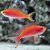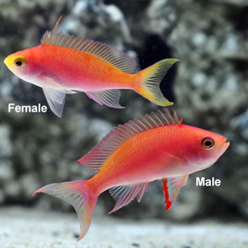 آنتیاس ماهیان راندال از لحاظ ظاهری نیز تفاوت چندانی در جنس نر و ماده ندارند و تفاوت عمده ی آنها در رنگ بندی آنها است. رنگ قالب بدن ماهی نر قرمز رنگ به همراه لکه هایی زرد رنگ است ولی جنس ماده رنگ زرد بیشتری در نوک صورت و باله ها دارد، ولی رنگ های ماهی نر روشن تر و شفاف تر از ماهی ماده می باشد. این ماهی بسیار پر جنب و جوش است و به این علت بهتر است چندین وعده در روز تغذیه شود.