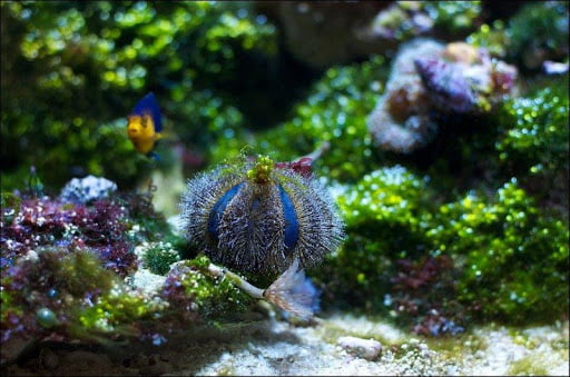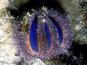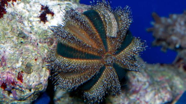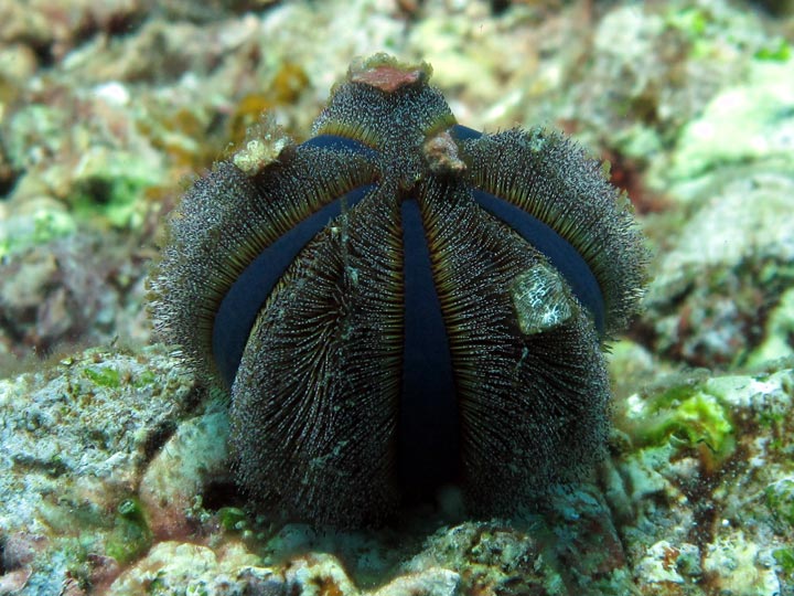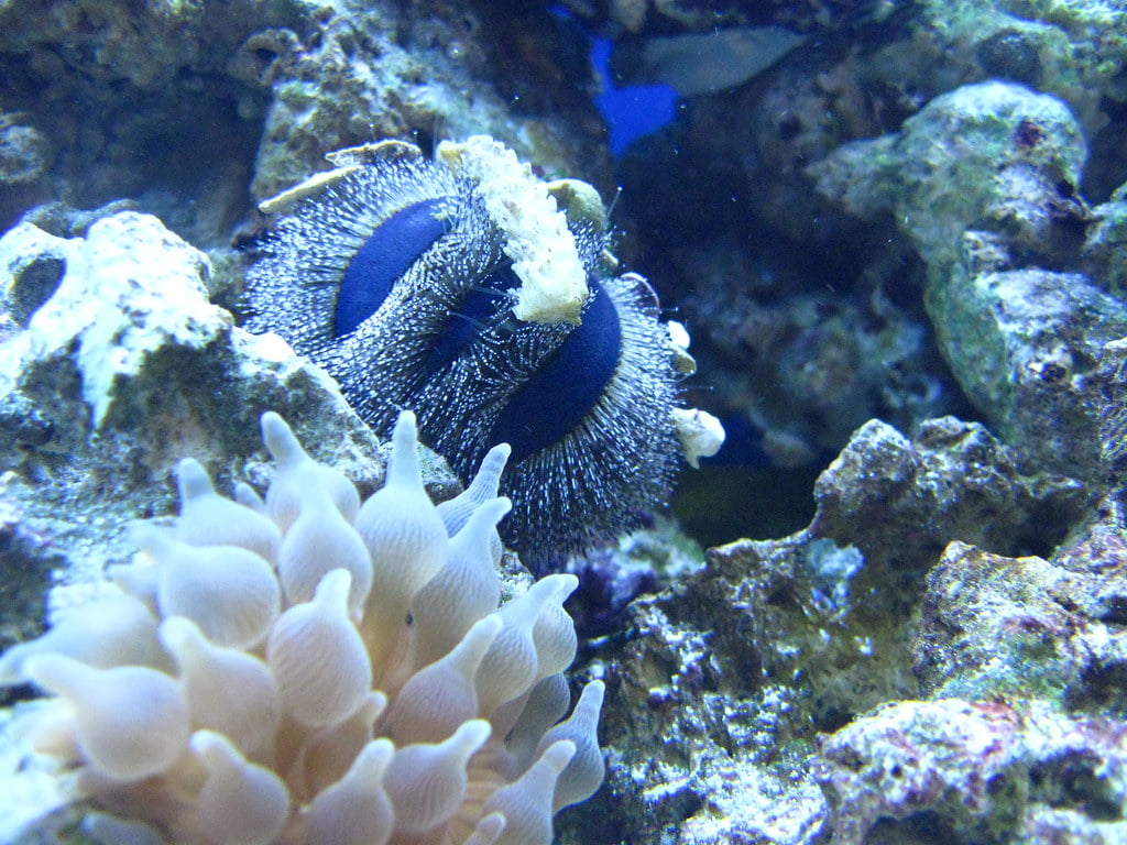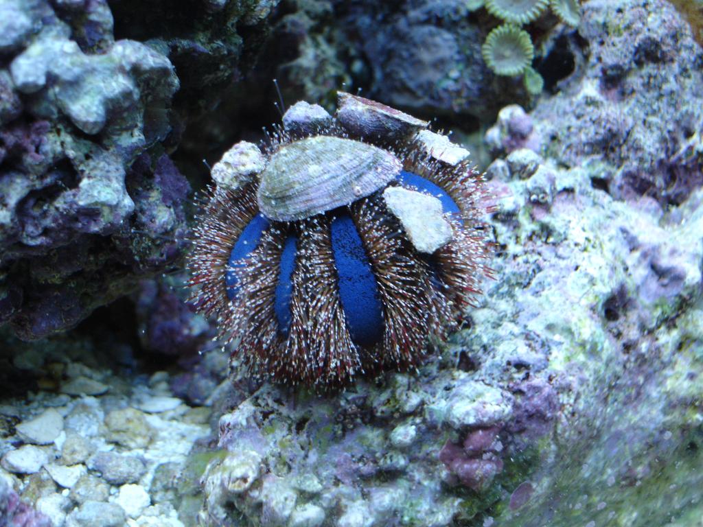 این توتیای دریایی زیبا در طول روز ، در کنار سنگ ها ، در غارها ، در زیر گیاهان و ماسه ها پنهان می شود . در هنگام شب از پناهگاه خود خارج می شود تا روی جلبک های اطراف پناهگاه خود پرسه بزند . این موجود عموما تنهایی پرسه می زند و تعدادی از آنها می توانند در آکواریوم نگهداری شوند اگر آکواریوم به اندازه کافی بزرگ باشد و غذای کافی یا همان جلبک کافی برای تغذیه آنها وجود داشته باشد . توتیا تاکسیدو آبی (Blue Tuxedo Urchin) یک گونه ی ریف سیف و با ظاهری جذاب و منحصر به فرد است.