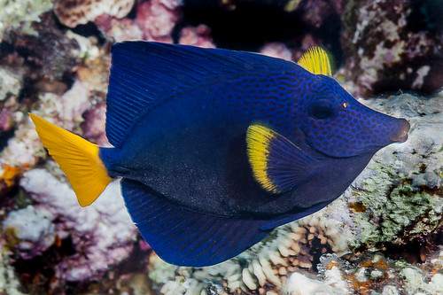 جراح ماهی دم زرد Yellowtail Tang همچنین با نام جراح ماهی بنفش Purple Tang نیز شناخته می شود و دارای بدنی به رنگ بنفش تا آبی همراه با دم زرد رنگ است، همچنین در باله های کناری نیز نواحی زرد دیده می شود. این ماهی به طور رسمی ابتدا گونه ای فقط از مناطق تپه مرجانی دریای سرخ شناخته شده بود، اما اکنون این ماهی در خلیج فارس، خلیج عدن و مناطقی از آب های سریلانکا نیز یافت می شود.