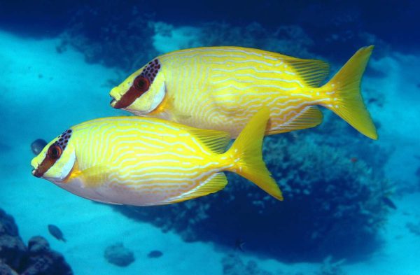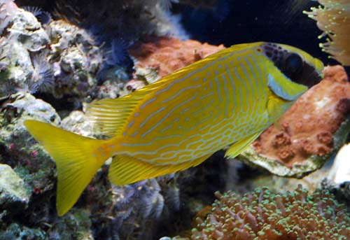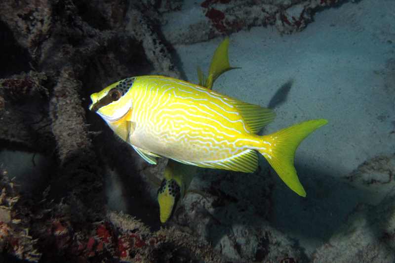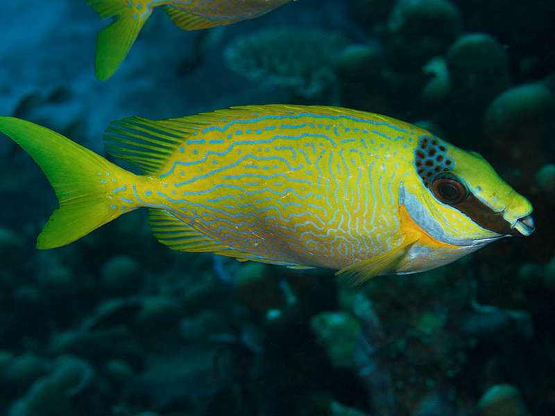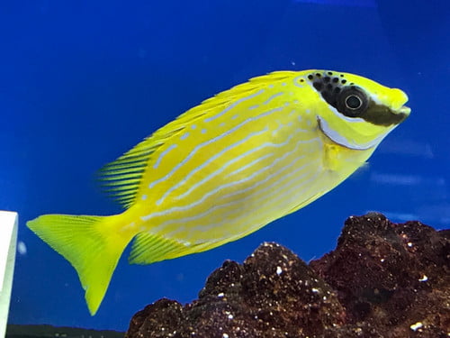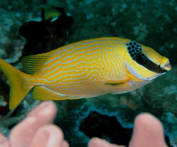 خرگوش ماهی آراسته Decorated Rabbitfish بومی مناطقی از آب های اقیانوس هند و اقیانوس آرام غربی هستند که به صورت انفرادی یا جفت در حال شنا کردن میان نواحی تپه مرجانی دیده می شوند. این ماهی بدنی به شکل مستطیل مانند دارد و دارای یک سری نقش های آبی رنگ زیبایی بر روی بدن خود است که آن را متمایز می کند. اصولا اکثریت قسمت بدن و دم این ماهی زرد رنگ می باشد، همچنین یک نوار عمودی تیره رنگ در صورت آن نقش بسته است که از روی چشم ها عبور کرده است.