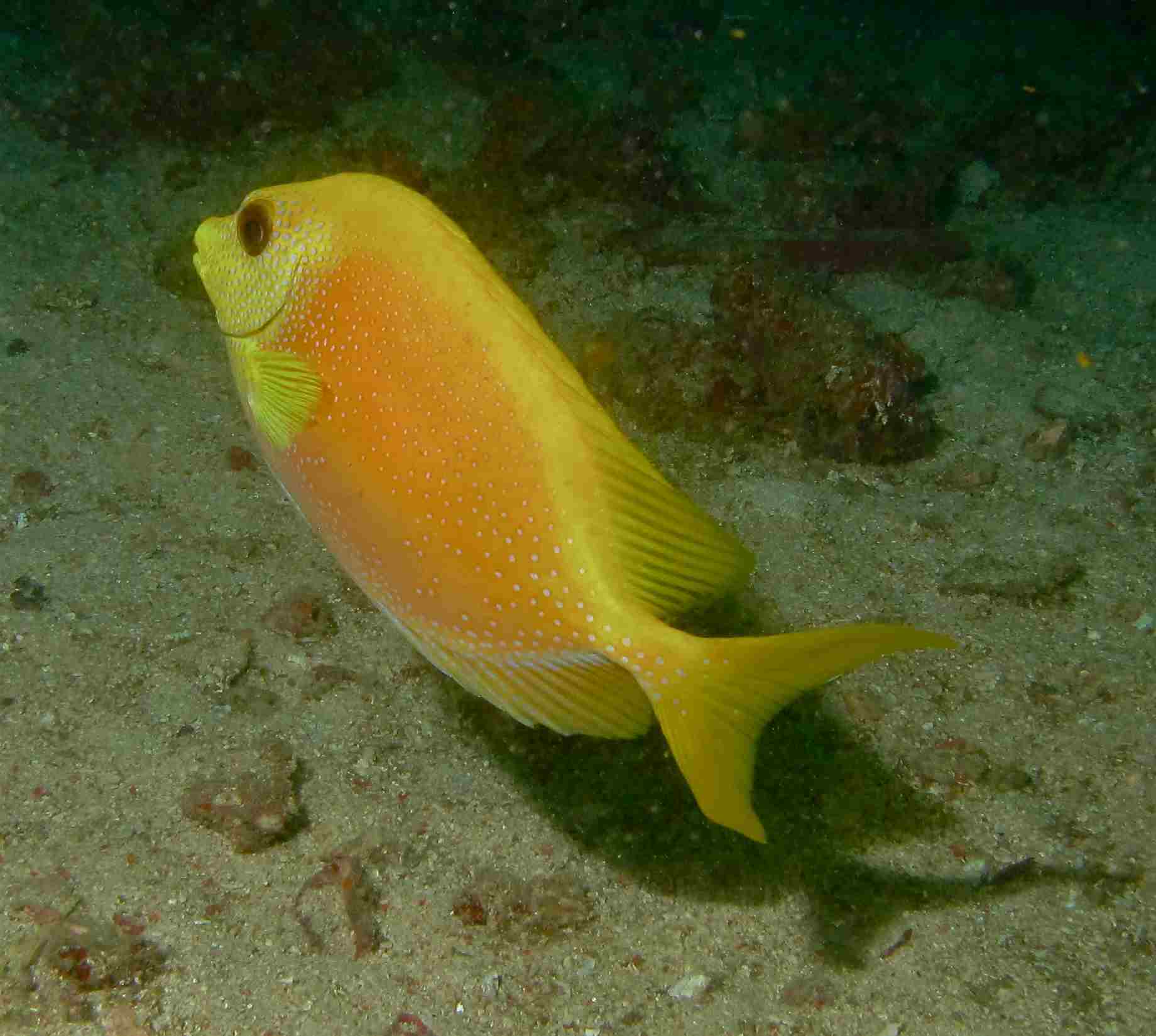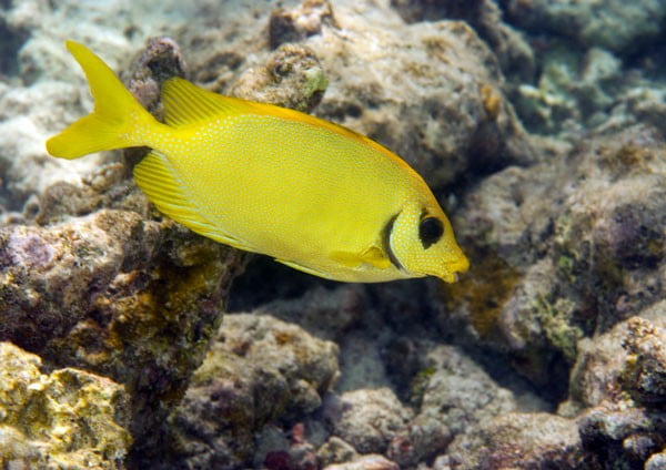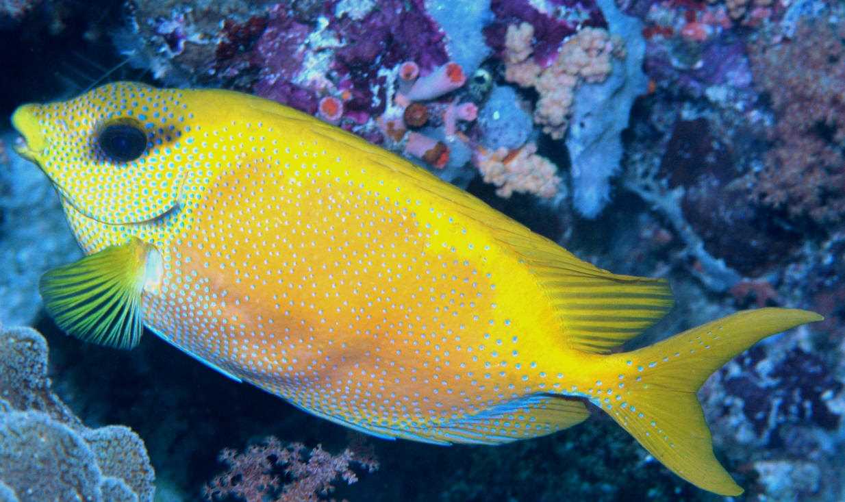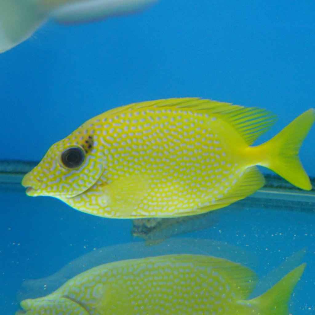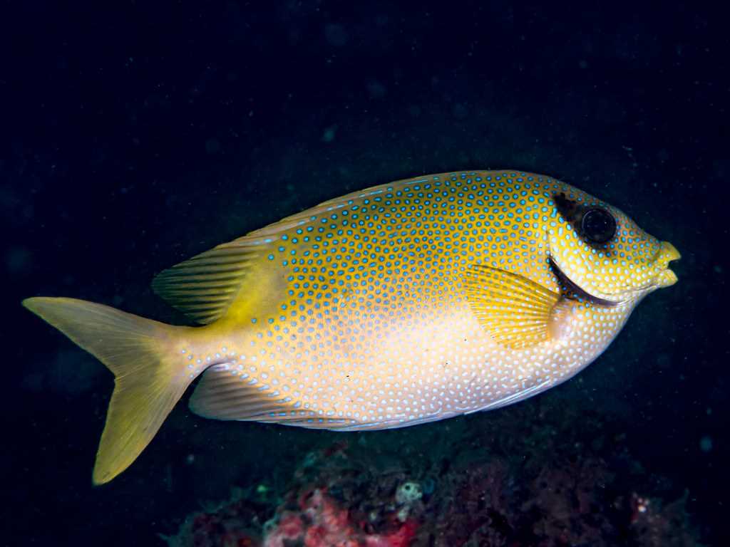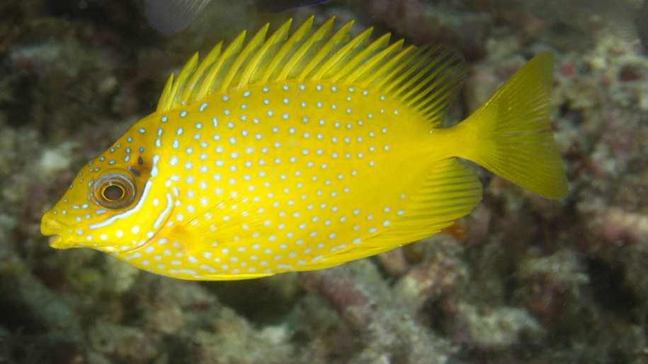 خرگوش ماهیان خال آبی Blue Spotted Rabbitfish، بومی مناطقی از آب های اقیانوس آرام و اقیانوس هند هستند که به صورت انفرادی یا جفت در حال شنا کردن میان نواحی تپه مرجانی دیده می شوند. این ماهی دارای بدنی به شکل مستطیل و زرد رنگ است، همچنین با گذشت زمان و با بالغ شدن ماهی، خالی های آبی رنگ زیبایی بر سراسر بدن آن ظاهر می شود.