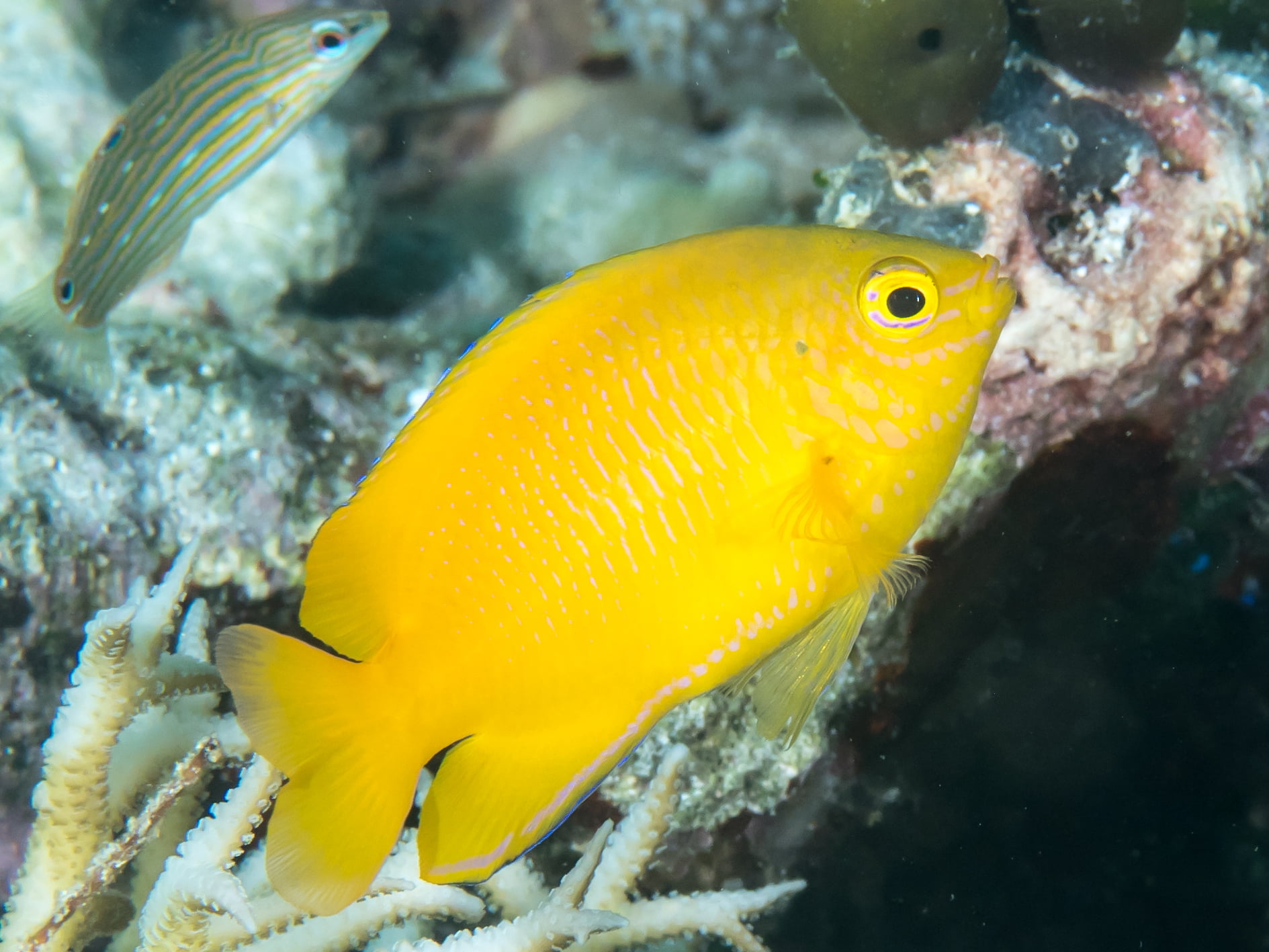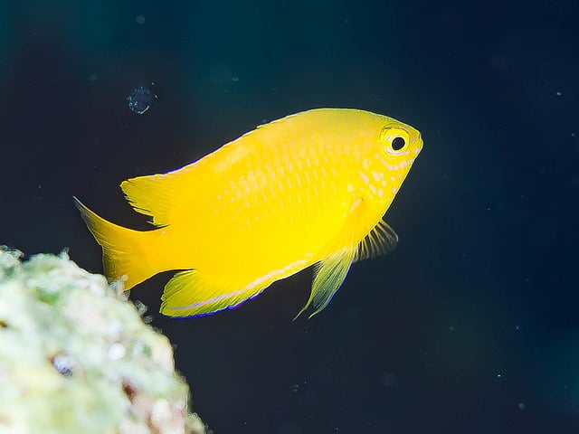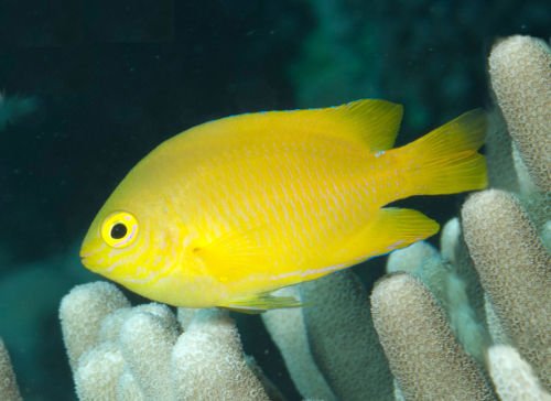 دامسل لیمویی Lemon Damselfish با نام دامسل ماهی زرد Yellow Damselfish نیز شناخته می شود و گاهی اوقات با دامسل سولفور نیز اشتباه گرفته می شود. این ماهی از زئوپلانکتون ها و جلبک های موجود در آکواریوم تغذیه می کند.