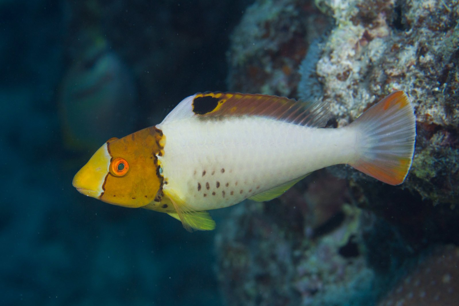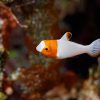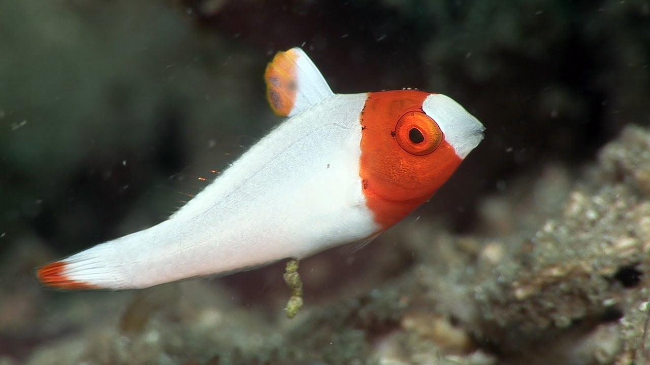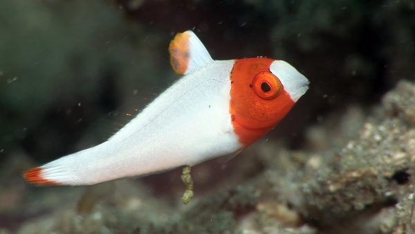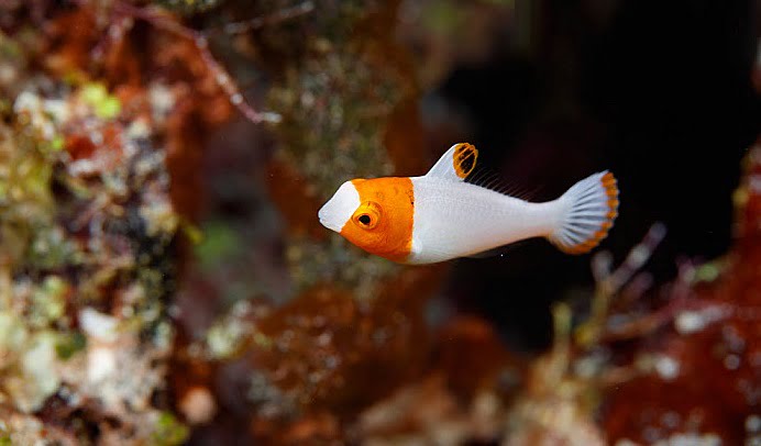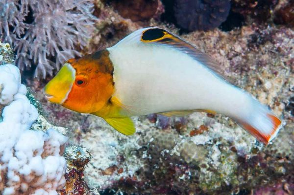 این ماهی در دوران جوانی دارای بدنی و دهانی به رنگ سفید یا زرد می باشد و خطی نواری مانند دور سر ماهی به رنگ نارنجی روشن نقش بسته است و باله زیرین ماهی نیز به رنگ نارنجی می باشد.