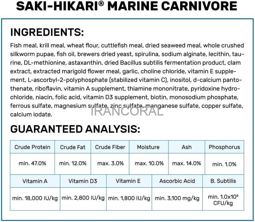 غذای تخصصی ماهیان آب شور گوشتخوار هیکاری Saki-Hikari شامل یک پروبیوتیک است که به طور خاص برای غذای ماهی به نام Hikari-Germ طراحی شده است و حاوی انواع مختلفی از پروتئین هایی است که با دقت انتخاب شده اند. منابع طبیعی غذا به افزایش رنگ و ایمنی در ماهی شما کمک می کند و در عین حال یک رژیم غذایی سالم را فراهم می کند. غذای ساکی هیکاری به سرعت هیدراته میشود و وقتی مستقیماً به مخزن اضافه میشود به آرامی غرق میشود و به ساکنان در تمام سطوح ستون آب اجازه مصرف میدهد. ترکیبات با دقت انتخاب شده همراه با Hikari-Germ به فرآیند هضم کمک می کند و به ماهی شما اجازه می دهد تا بیشترین بهره را از غذا داشته باشد.