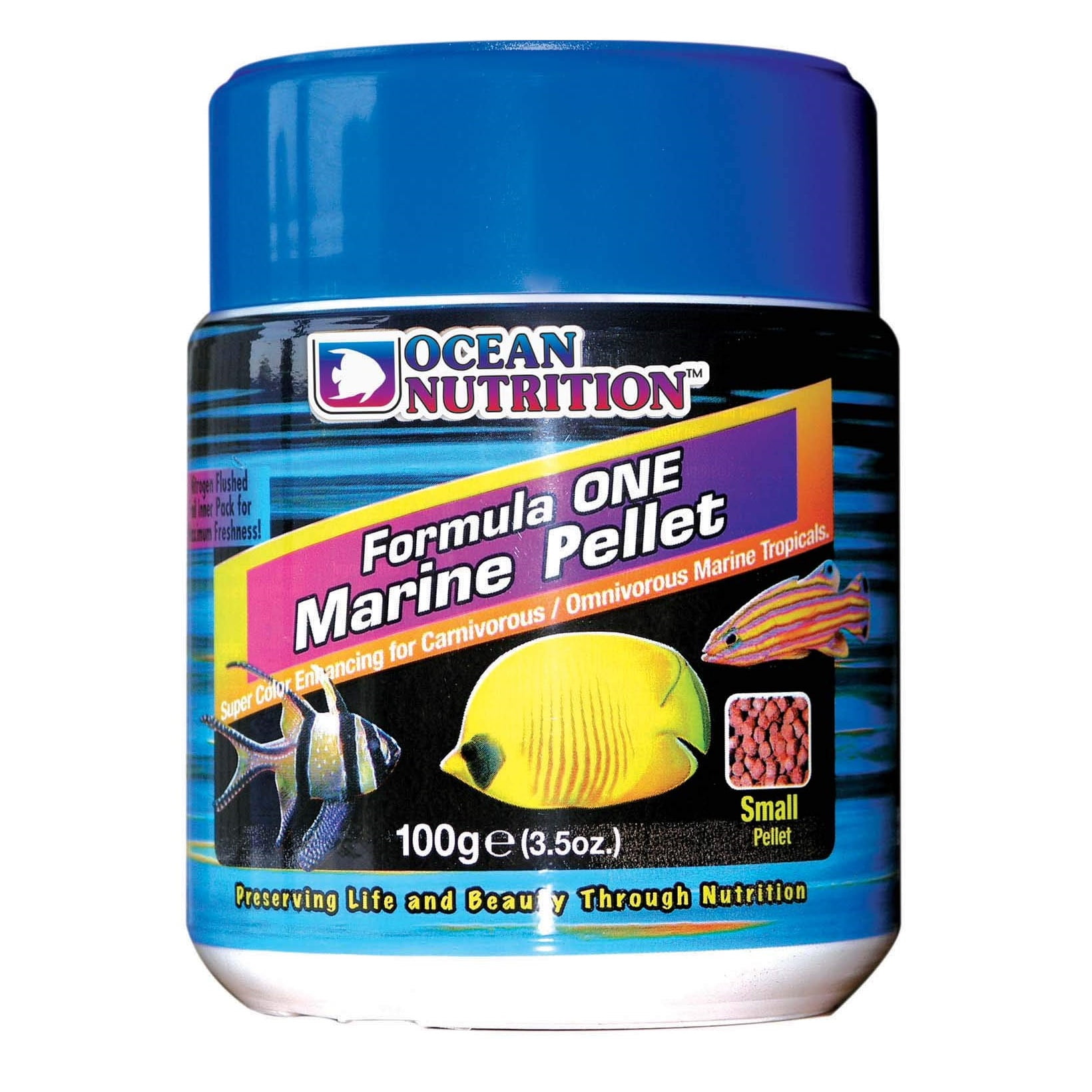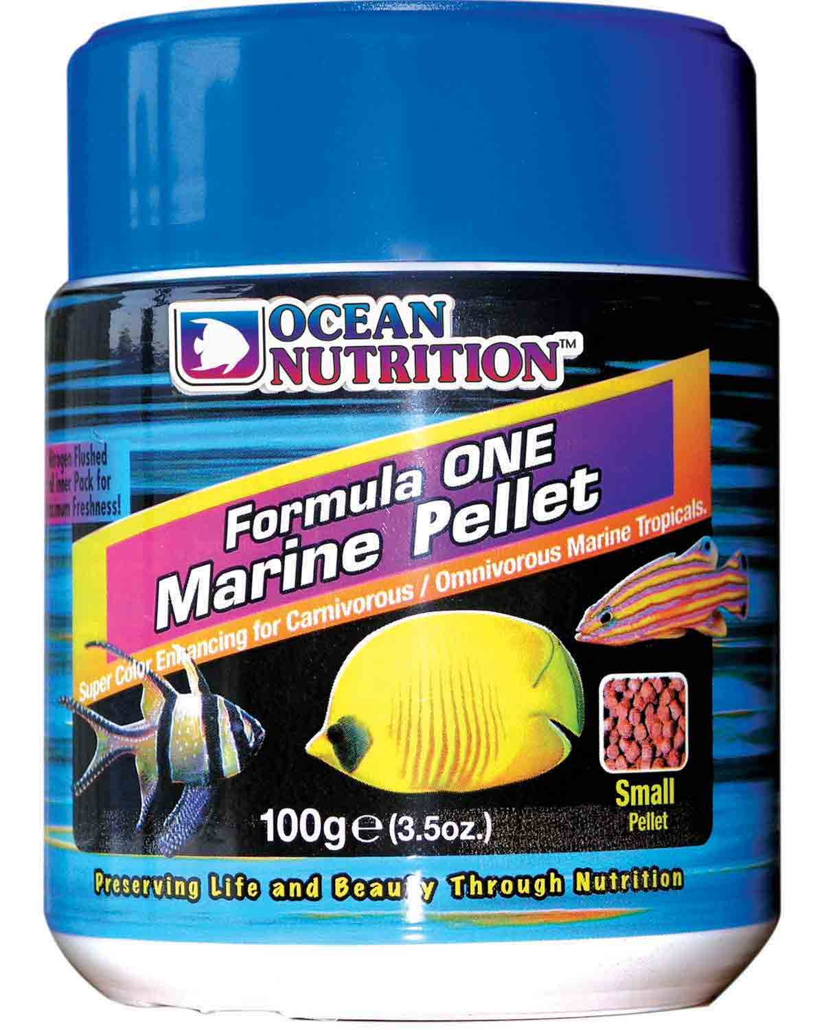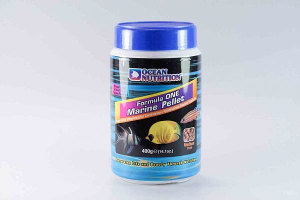 غذای ماهی فرمول ۱ اوشن نوتریشن Ocean Nutrition Formula One Pellets مناسب جهت تغذیه انواع ماهیان دریایی، مانند: دلقک ماهیان، دامسل ها، کرومیس ها، آنتیاس ها، بلنی ها و پروانه ماهیان.