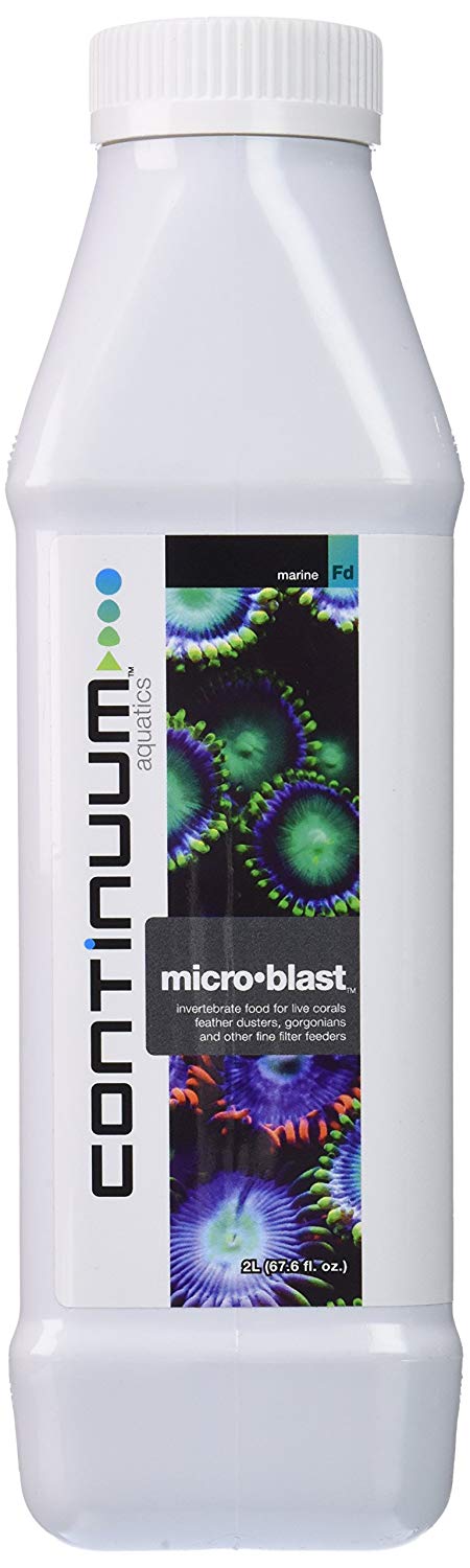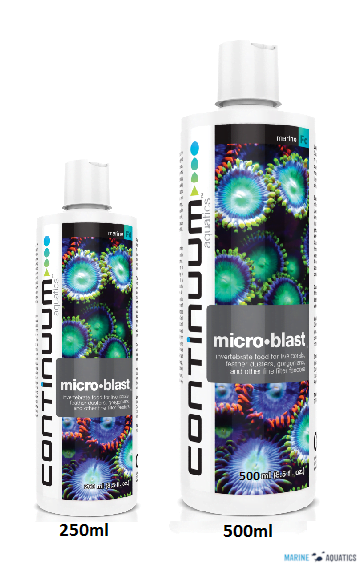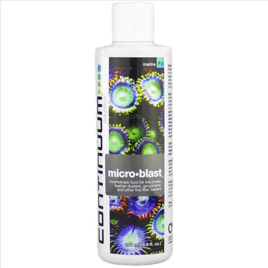 محصول میکرو بلست (Micro Blast) برند کانتینیوم آکواتیکس ، یک رژیم غذایی طبیعی و بالانس شده برای اسفنجها(sponges)، شقایقها(anemones)، گرگانیاها(gorgonians)، مرجانهای سخت و نرم با پلیپهای کوچک(small polyped soft and stony corals)، خرچنگها(clams)، فیدر داسترها(feather dusters)، تونیکاتسها(tunicates) و بقیهی فیلتر فیدرها(filter feeders) میباشد که طی سالها آزمایش توسعه یافته است. این محصول با تأمین همهی اسیدهای آمینه ضروری مورد نیاز بی مهرگان، از جمله اسیدهای چرب امگا مهم EPA و DHA و طیف کاملی از ویتامینها و مواد معدنی، رشد و افزایش رنگ موجودات دریایی را فراهم میآورد.