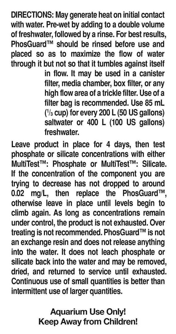 فسفات گیر فوسگارد ممکن است در اولین تماس با آب گرما ایجاد کند. با اضافه کردن دو برابر حجم، آب شیرین قبل از اضافه کردن به آکواریوم و مرطوب کردن و شستشو دهید. برای دریافت بهترین نتیجه، فوسگارد PhosGuard باید قبل از استفاده شستشو داده شود و به گونه ای در مسیر آب قرار بگیرد که عبور جریان آب از تمام سطح آن به حداکثر برسد اما نه به گونه ای که در برابر جریان خود به شدت حرکت کند و مانع جریان شود. ممکن است از این محصول در فیلترهای سطلی، فیلترهای تصفیه، فیلتر و راکتورهای مدیا یا هر قسمت که جریان قوی داشته باشد مورد استفاده قرار گیرد. استفاده از کیسه فیلتر مناسب مدیا توصیه می شود.