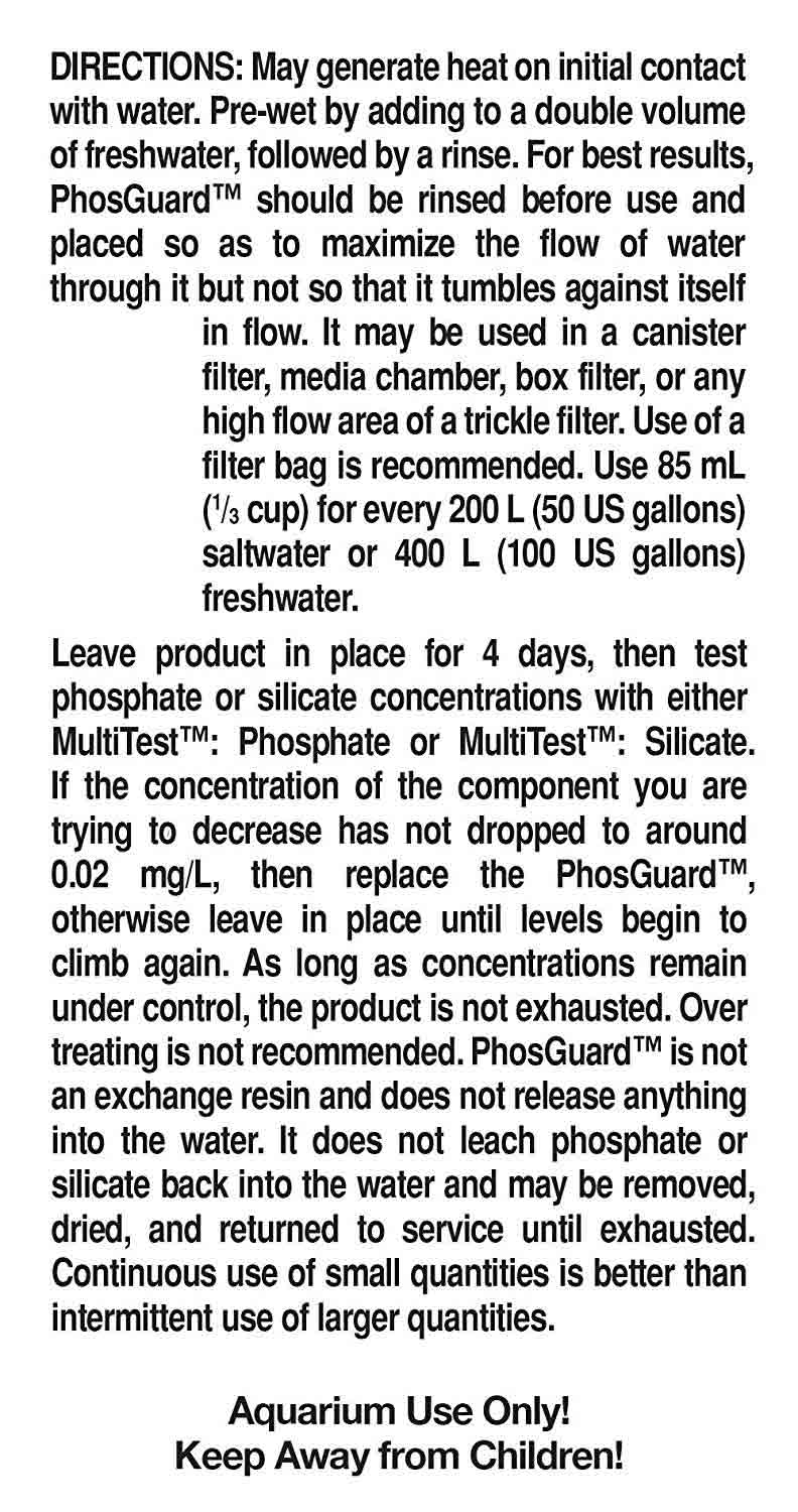 اگر غلظت مؤلفه ای که سعی در کاهش آن دارید به حدود 0.02 میلی گرم در لیتر کاهش نیافته ،فوسگارد PhosGuard را جایگزین کنید ، در غیر این صورت در جای خود بگذارید تا سطح پارامتر مورد نظر دوباره شروع به افزایش کند. تا زمانی که سطح مورد نظر، تحت کنترل باقی بماند، فوسگارد هیچ ماده ای را به آب برنمی گرداند.