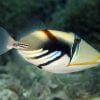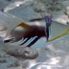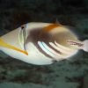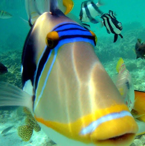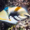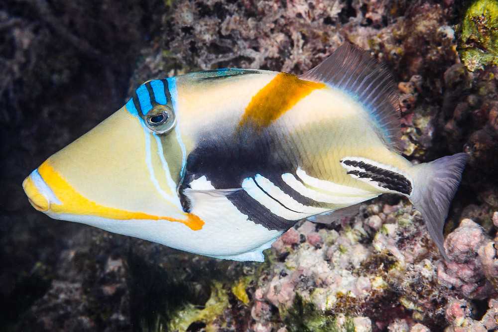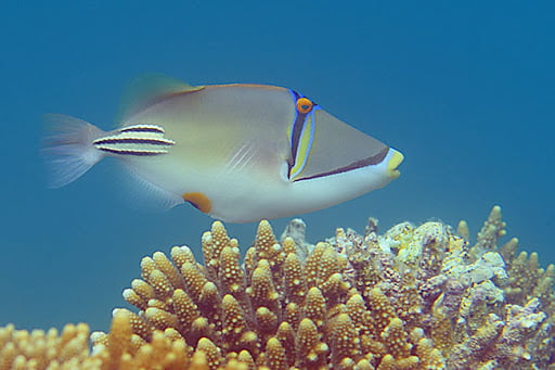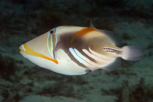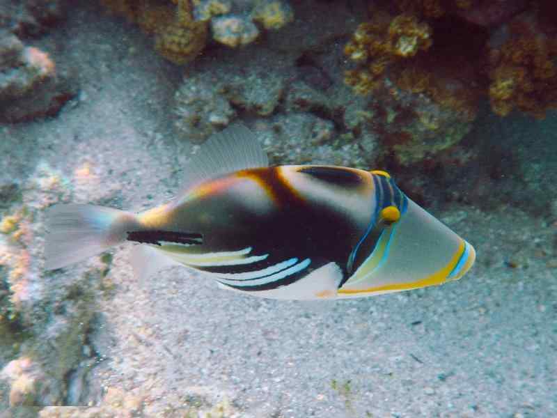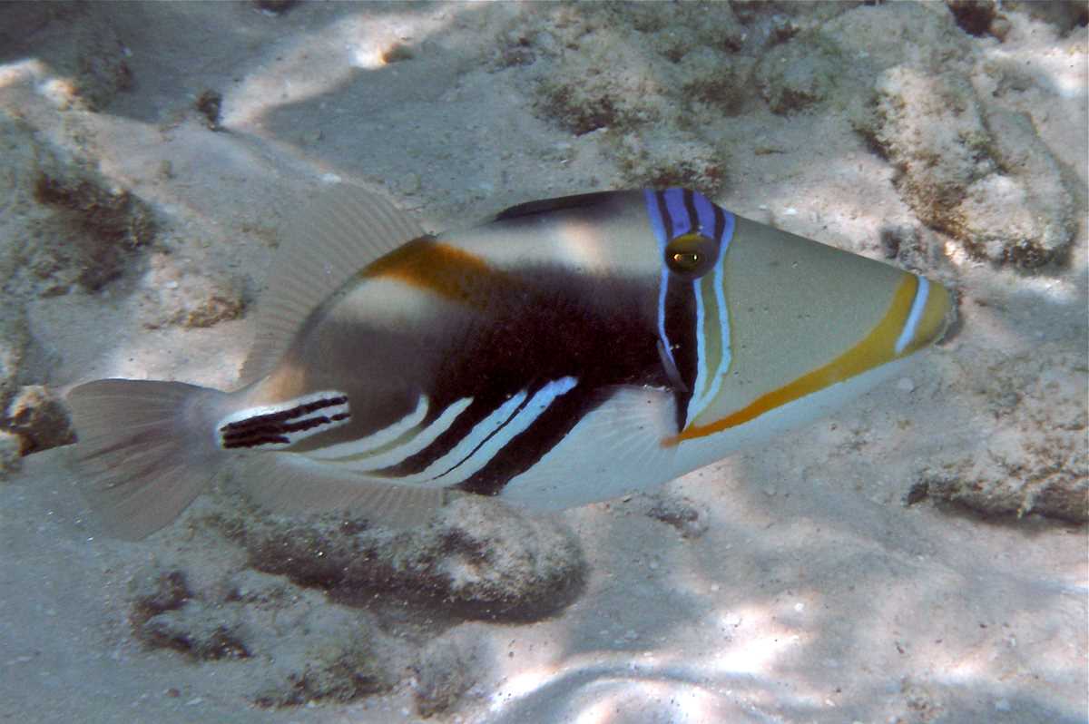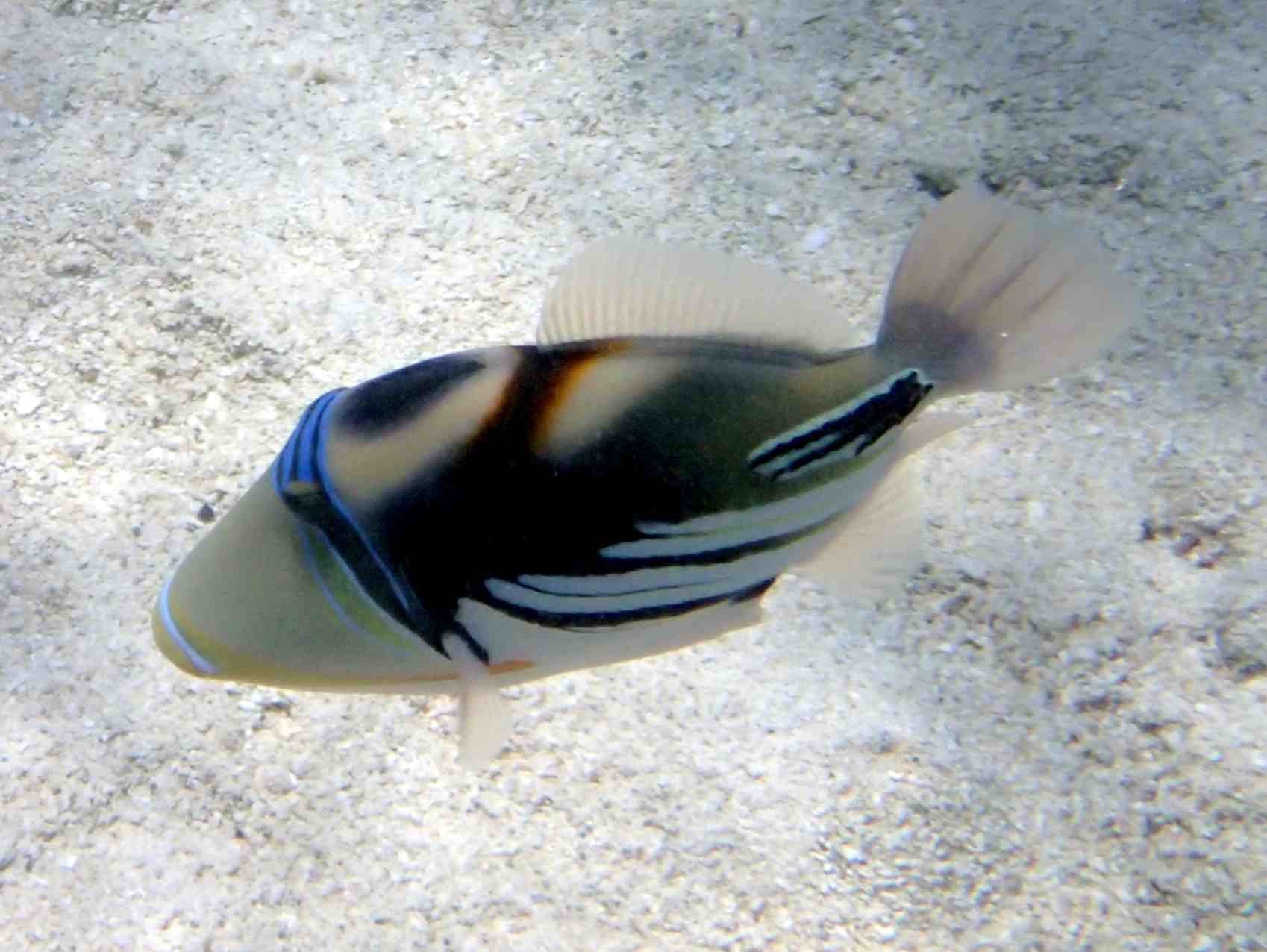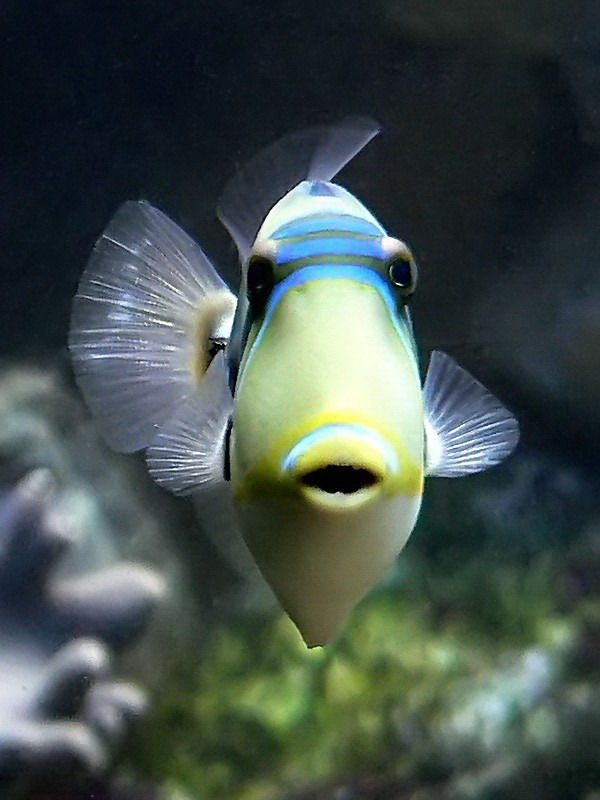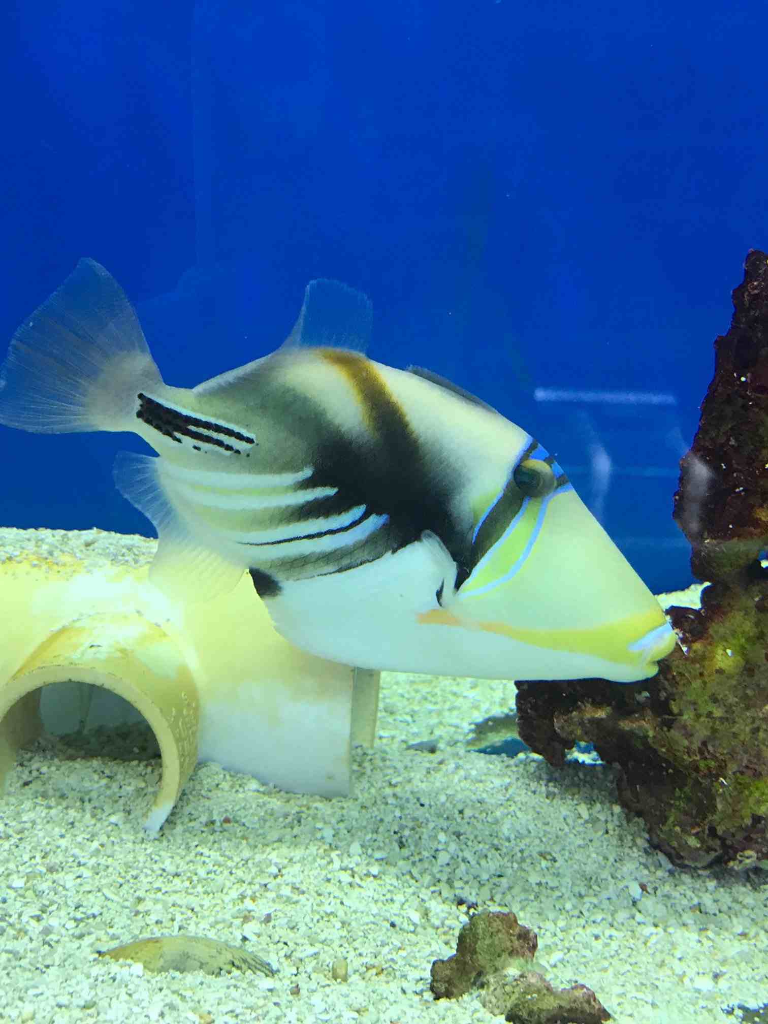 ماشه ماهی پیکاسو هومو Humu Picasso Triggerfish برای کوتاه نگه داشتن دندان های در حال رشد خود به هر شی سختی در آکواریوم و یا لاک بدن سخت پوستان، نوک می زند.