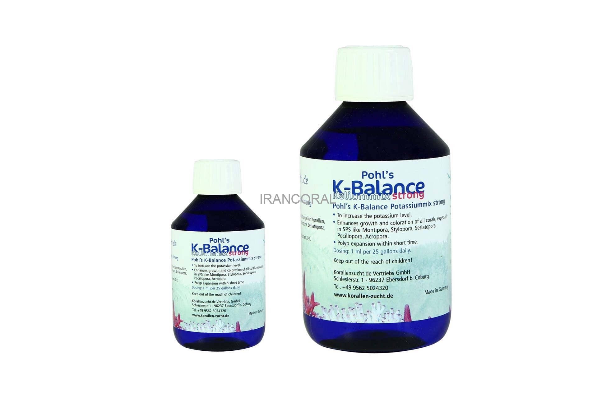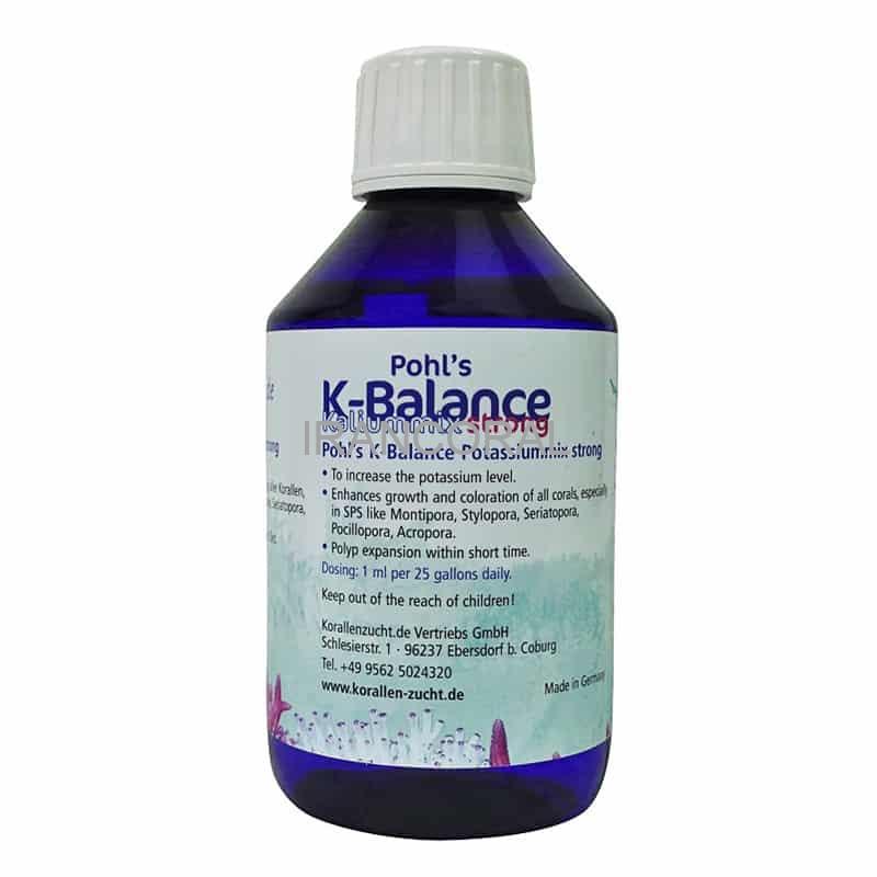 پتاسیم یکی از عناصر اصلی در آب دریا است و سطوح طبیعی آن بسیار شبیه به کلسیم است، 380-410 میلی گرم در لیتر. در حالی که به سرعت کلسیم مصرف نمی شود، حفظ سطوح مناسب برای رسیدن به رنگ و رشد مرجانی ایده آل مهم است. آزمایشهای KZ نشان داده است که مخازن با کمبود پتاسیم شناخته شده رشد و رنگبندی بهتری را طی چند روز پس از استفاده از محلول کی بالانس استرانگ کورالن زاخت K-Balance نشان میدهند. محلول کی بالانس استرانگ کورالن زاخت حاوی چندین نمک پتاسیم در غلظت های بالا است.