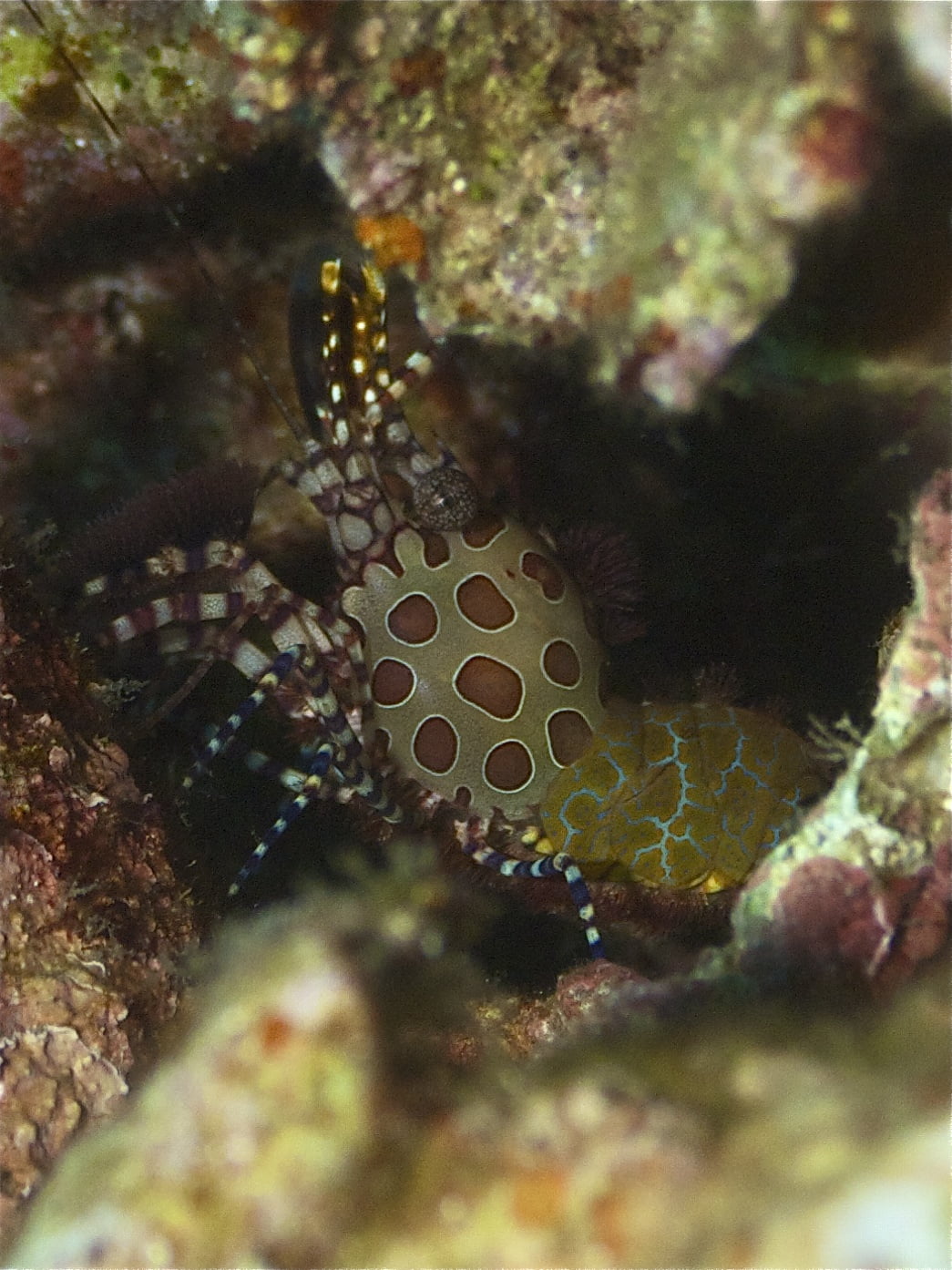 میگوی مرمری شبگرد است و در طول زمان شب، رنگ بدن آن عمدتاً قرمز می شود که به آن کمک می کند تا در زمان تاریکی و گرگ و میش ترکیب شود.