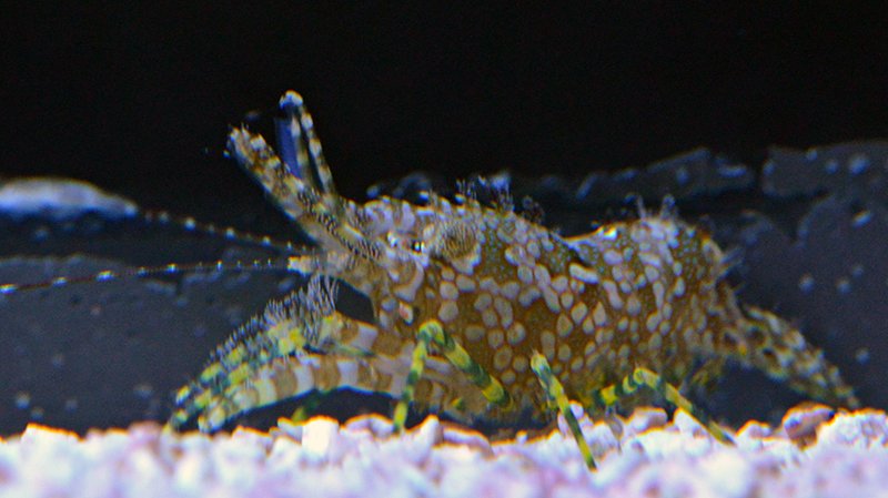 هنگامی که میگو مرمری وارد آکواریوم می شود، به مکانی تاریک نیاز دارد تا در آن پنهان شود. پس از سازگاری، در طول روز شروع به پرسه زدن می کند. معمولاً در کنار صخره های مرجانی در پایه صخره یافت می شود. میگوی مرمری نسبت به سطح مس یا نیترات بالا حساس است و تحمل نمی کند. همچنین این میگوی دریایی برای پوست اندازی ایده آل به سطح مناسبی از ید در آب نیاز دارد.