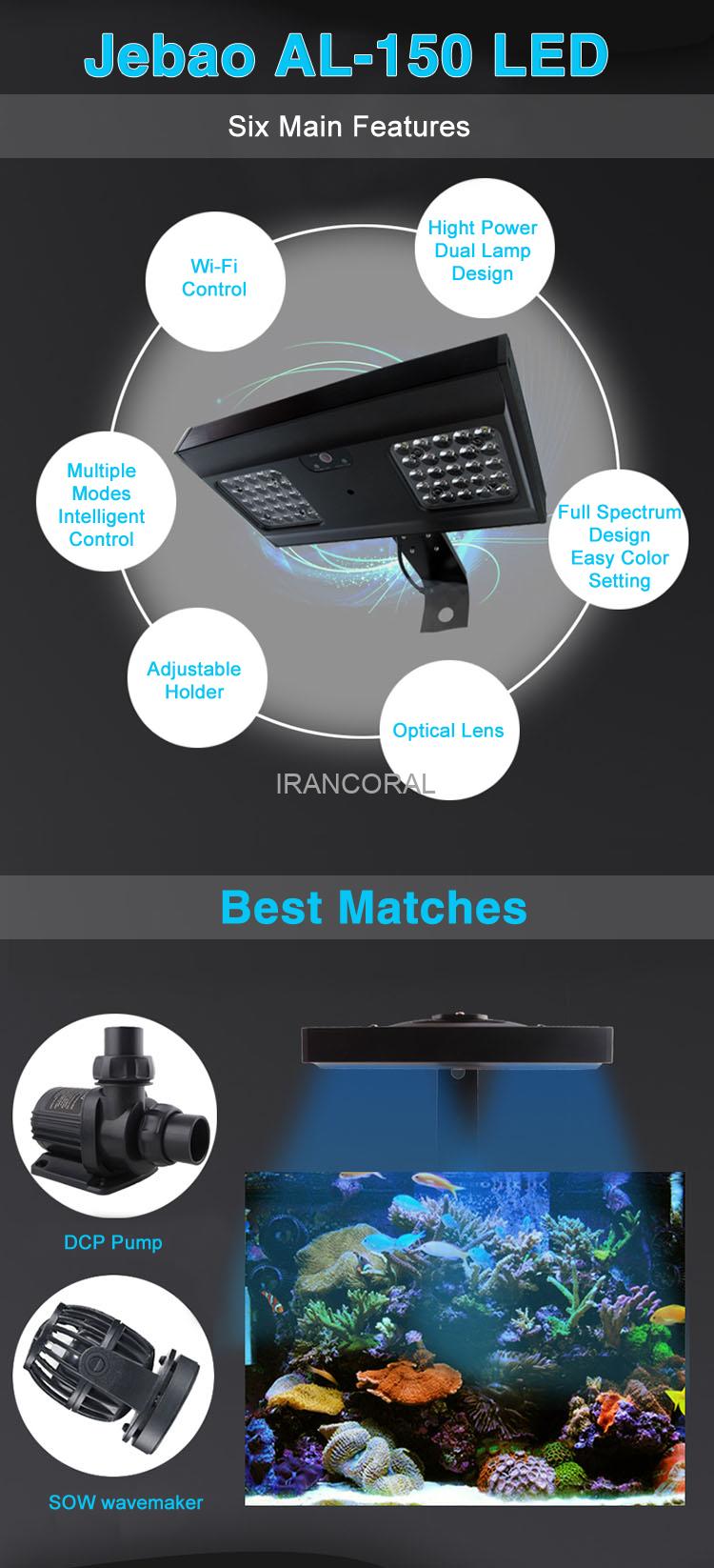 نور آکواریوم آب شور جبائو AL-150 یکی از محصولات حرفهای شرکت جبائو و مناسب برای آکواریومهای آب شور تپه مرجانی و فیش اونلی و حتی آکواریومهای آب شیرین است.