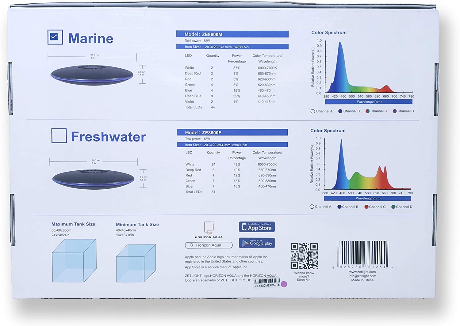 نور ال ای دی آب شور یوفو زتلایت ZetLight UFO ZE-8300 Marine Light یک سیستم نورپردازی آکواریوم بسیار با کیفیت و درجه یک است که دارای یک برنامه قوی برای کنترل نور است. این نور با طیف رنگی کامل و 44 LED دارای 55 وات است و می تواند Par بسیار کاربردی را برای مخازن و آکواریوم های آب شور تپه مرجانی ارائه دهد.