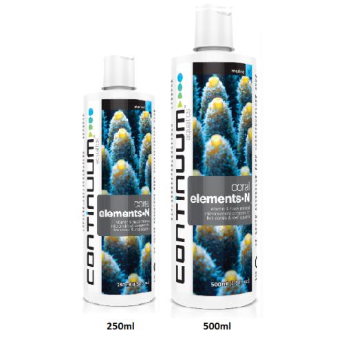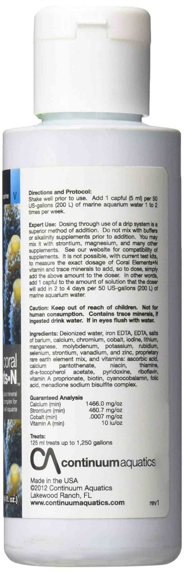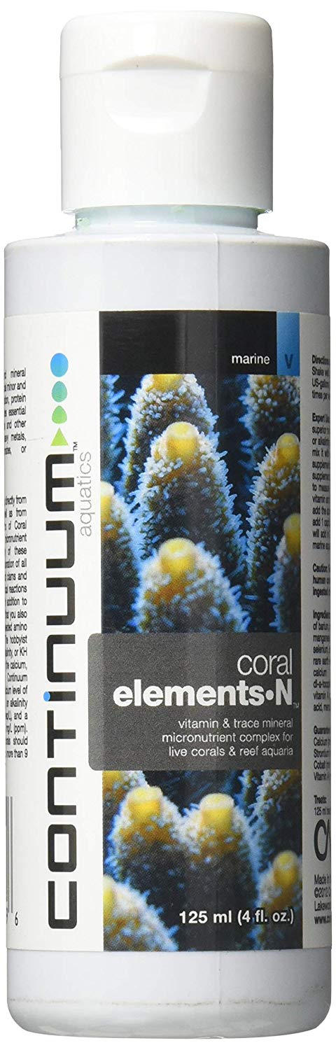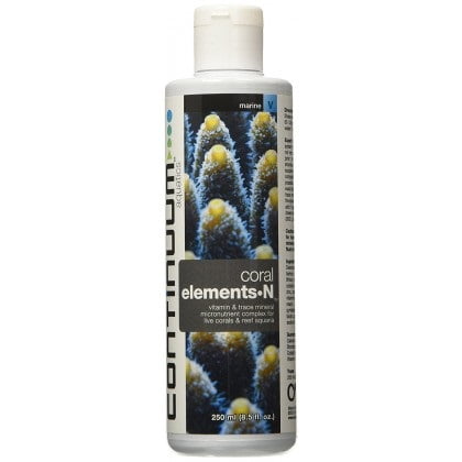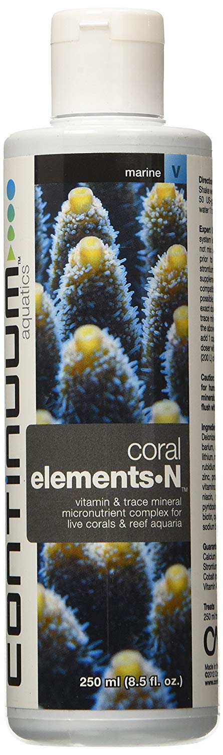 ویتامین مرجان Continuum Aquatics Coral Elements•N، ترکیبی از ویتامین ها و مواد ریز مغذی معدنی می باشد که جایگزین مواد معدنی مهم و کمیاب از دست رفته توسط پروتئین اسکیمرها و ازن می شود و ویتامین های لازم را برای رشد مرجان های زنده و سایر بی مهرگان فراهم می کند. این محصول حاوی فلزات سنگین، فسفات، سیلیکات، گلوکونات و پلی گلوکونات نمی باشد.