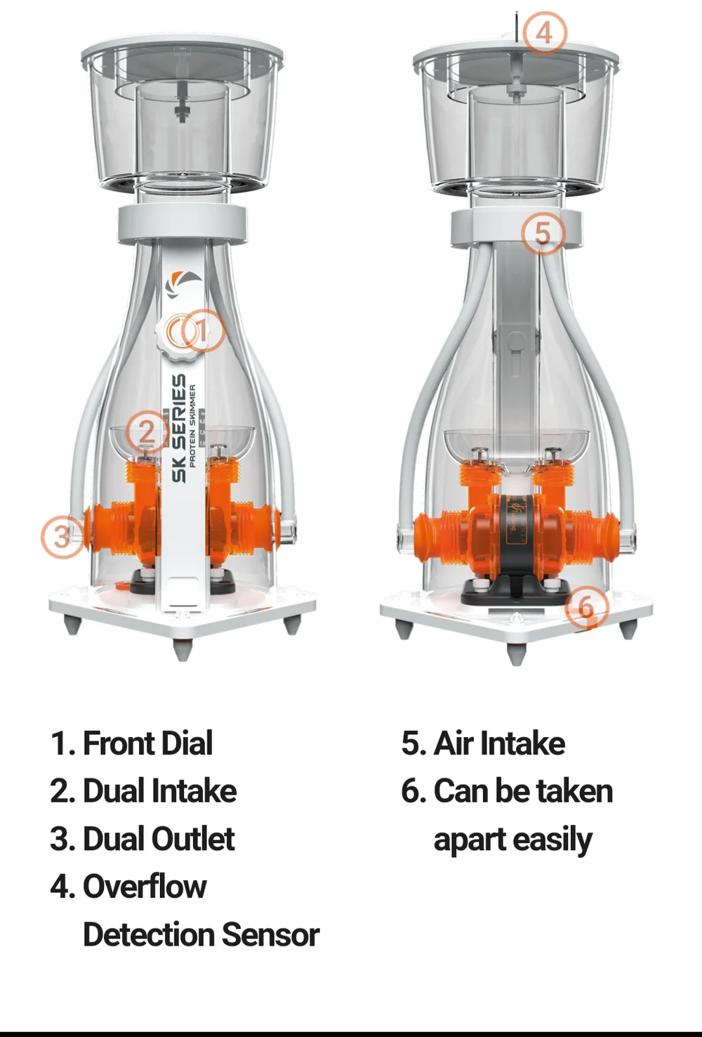 پروتئین اسکیمر SK400 مکس اسپکت جامپ همچنین مجهز به یک سنسور سرریز در کاپ جمعآوری خود است که در صورت فعال شدن، پمپ اسکیمر را خاموش میکند تا از هرگونه حادثه جلوگیری شود. هنگامی که سنسور شناور به موقعیت عادی خود بازگردد، پمپ پس از ده ثانیه تأخیر به طور خودکار روشن میشود. کنترلر موجود را میتوان برای تنظیم آسان سرعت پمپ یا ورود به “حالت تغذیه” استفاده کرد که پروتئین اسکیمر SK400 مکس اسپکت را به مدت 600 ثانیه در طول وعدههای غذایی متوقف میکند.