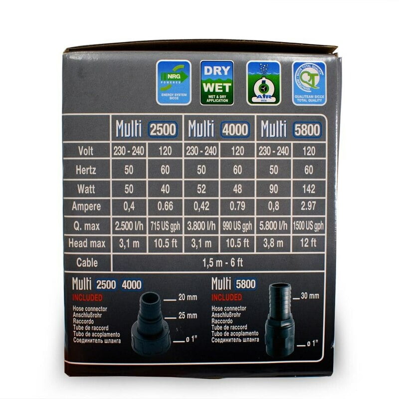 پمپ گردش آب مولتی SICCE برای هر دو نوع استفاده داخلی و خارجی طراحی اند. این پمپ های آب درجه حرارت پایین، عملکرد عالی و مصرف کم را تضمین می کنند. آنها به لطف یک طراحی مستحکم و جمع و جور، زمینه استفاده گسترده ای را در انواع مصارف آبی آکواریومی و... فراهم می کنند.