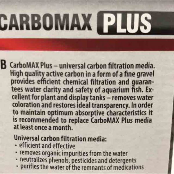 کربومکس پلاس CARBOMAX PLUS، زغال فعال شده با کیفیت مناسب و بسیار کاربری، موثر در حذف و جذب مواد شیمیایی، حذف مس مربوط به دارو از آب، از بین بردن بوی نامطلوب و رنگ آب می باشد که قابلیت استفاده در انواع آکواریوم های آب شور و آب شیرین را دارد و یکی از پرکاربردترین اجزای فیلتراسیون شیمیایی است.