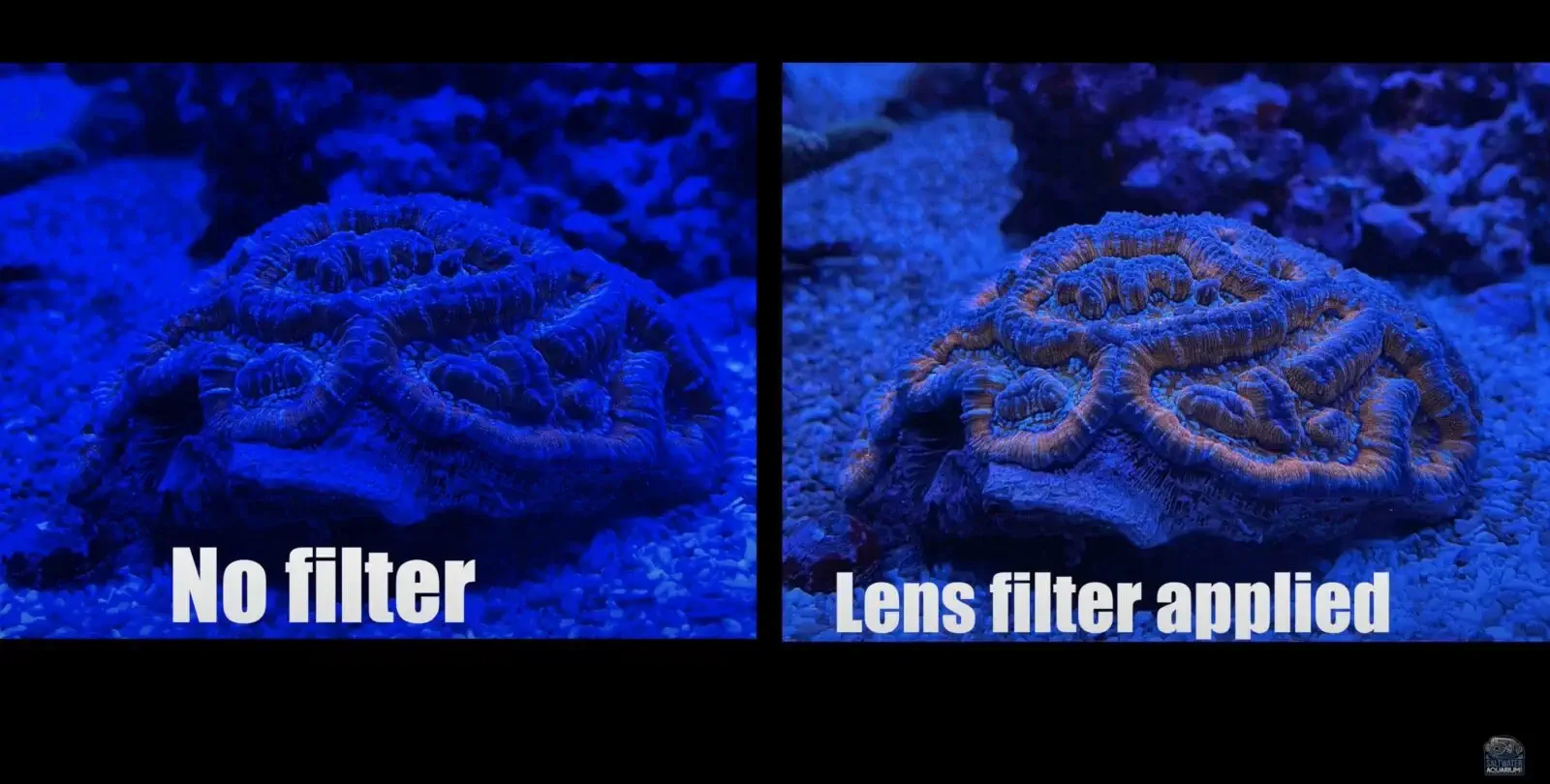 نورهای آبی قوی که در آکواریوم‌های ریف برای رشد مرجان‌ها استفاده می‌شوند، باعث می‌شوند تصاویر ثبت‌شده با دوربین‌های معمولی یا گوشی‌های هوشمند، دارای رنگ‌های نادرست و بیش‌ازحد آبی باشند. فیلترهای لنز با کاهش نور آبی و تقویت رنگ‌های گرم‌تر مانند قرمز و نارنجی، به ثبت تصاویر با رنگ‌های واقعی و جذاب کمک می‌کنند.