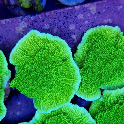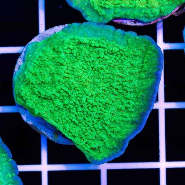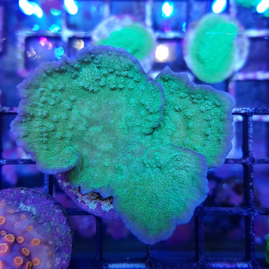 مرجان مونتیپورا سبز نئون Montipora Capricornis Coral یک مرجان پوششی با صفحه ای بنفش و لبه های حاشیه ای به رنگ بنفش روشن است.